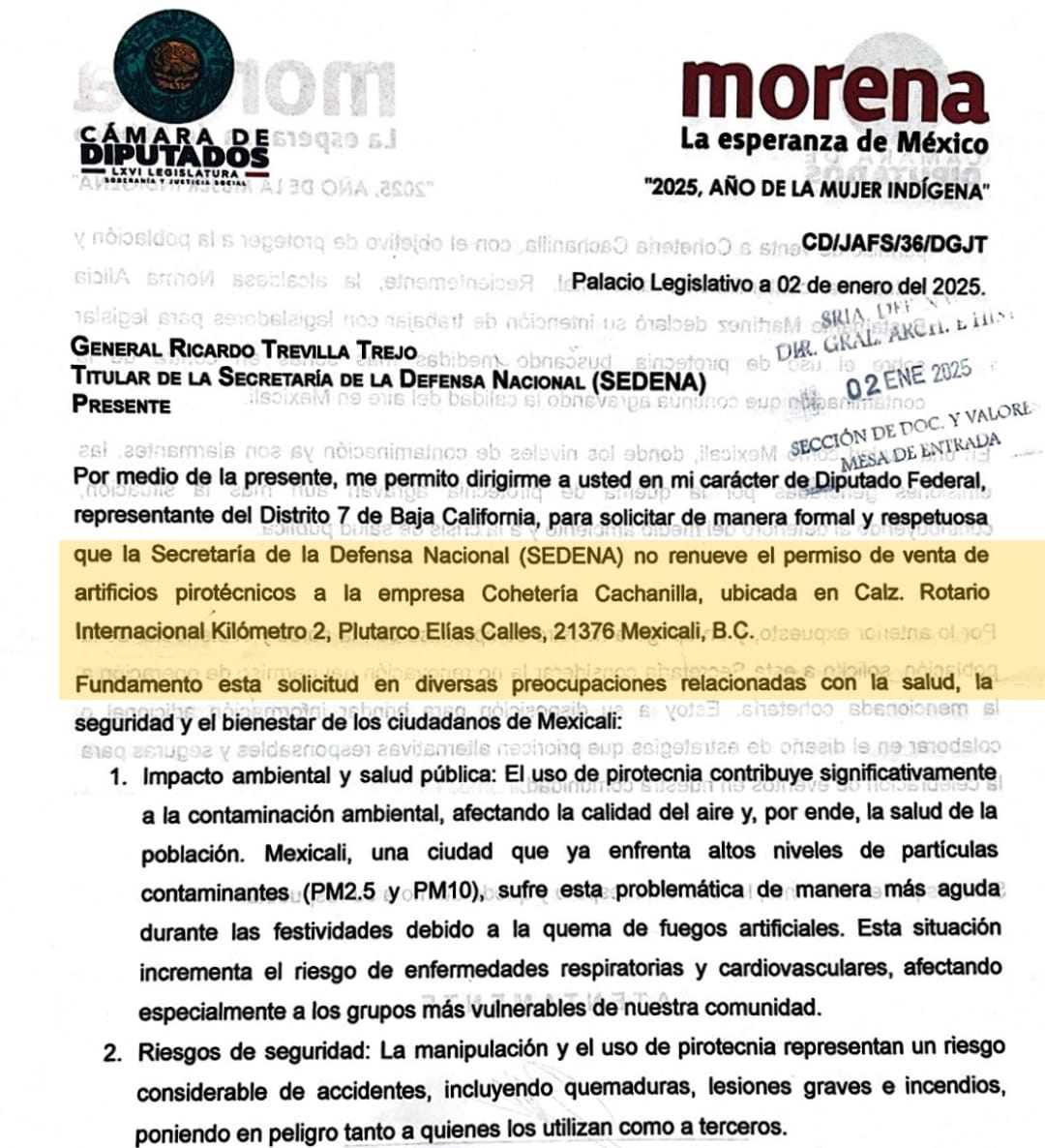 El coordinador de los diputados federales de Baja California Armando Samaniego exhortó a la Secretaría de la Defensa Nacional (SEDENA) a no renovar el permiso de operación a la cohetera en Mexicali hasta que se lleve a cabo un análisis detallado e imparcial sobre el impacto ambiental, social y de salud pública del uso de pirotecnia en la región.