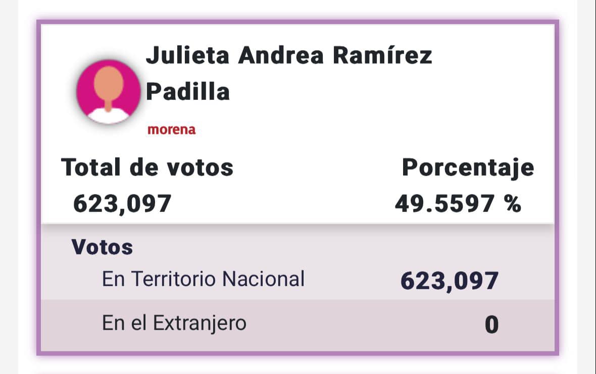 Mexicali.-Según el Programa de Resultados Electorales Preliminares (PREP), la tendencia es irreversible ya que con mas de 622 mil votos contabilizados en el 93% de las actas y con una ventaja de 28 puntos del segundo lugar, está claro que Julieta Ramírez, del partido Morena, será la próxima Senadora. Así mismo, el PREP también indica que Morena ha logrado una victoria completa en la entidad, consolidando su posición en la región.